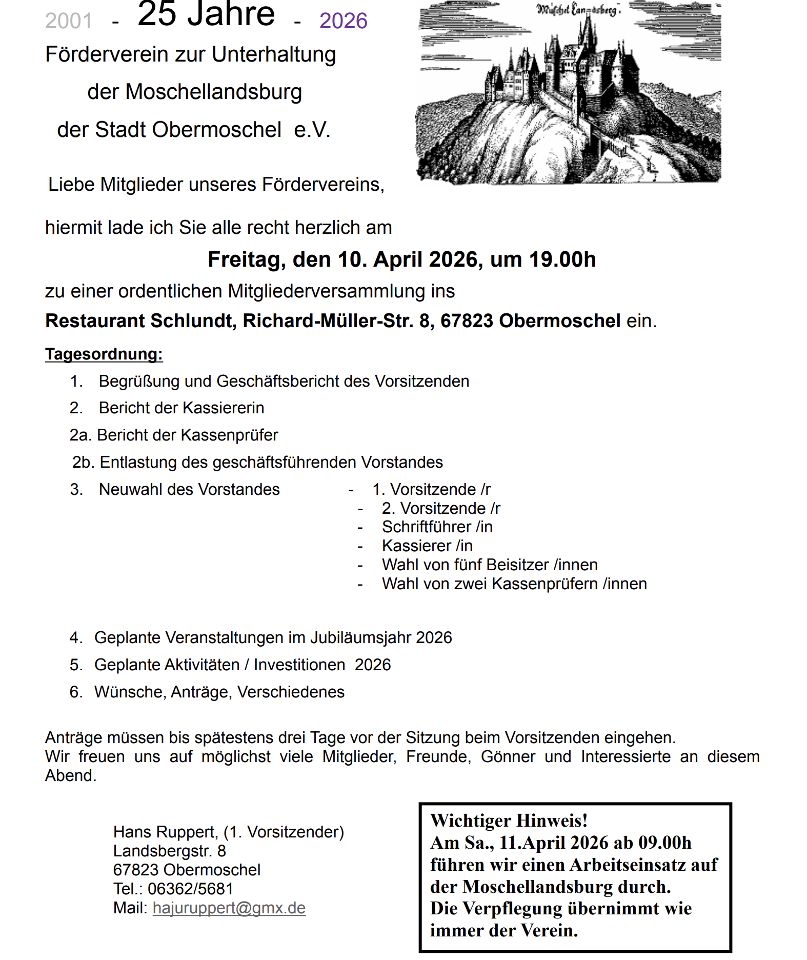 Jahreshauptversammlung Förderverein zur Unterhaltung der Moschellandsburg der Stadt Obermoschel e.V.
