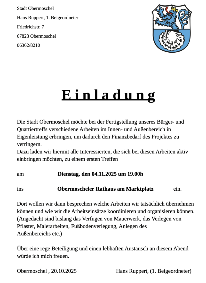 Beim ersten Treffen zum neuen Bürger- und Quartiertreff am 03.11.2025, haben sich bereits viele engagierte Obermoscheler gefunden, die mit Eigenleistung bei der Fertigstellung unterstützen möchten. Dafür bereits jetzt vielen Dank!…