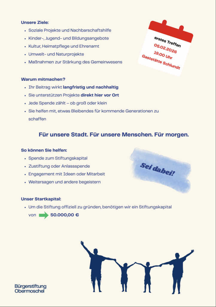 Unter diesem Motto haben sich bereits einige Freiwillige aus Obermoschel zusammengefunden, um die Bürgerstiftung Obermoschel aus der Taufe zu heben.