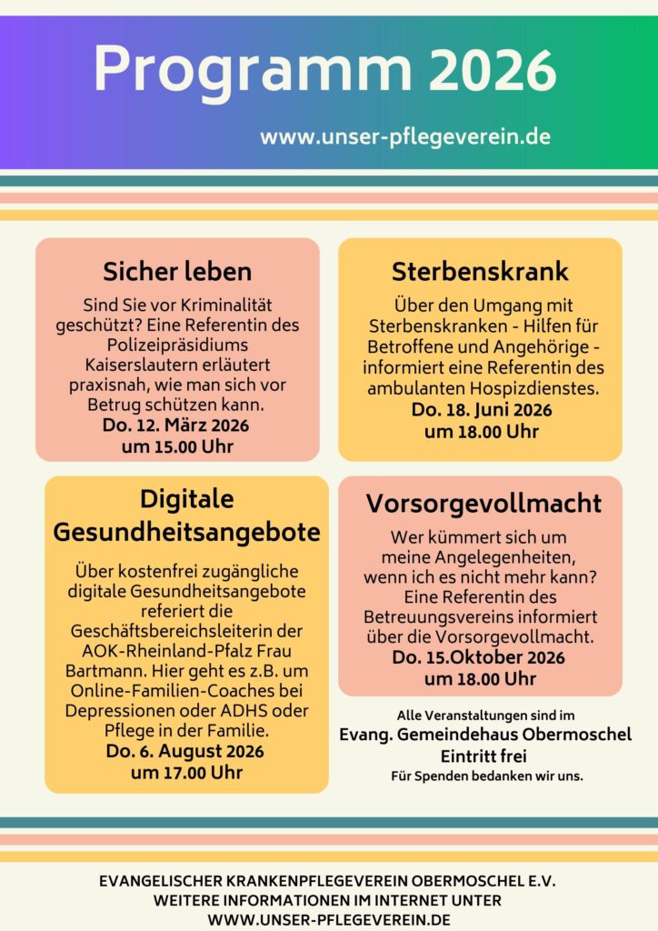 Wir informieren dieses Jahr darüber, wie man sich vor Betrug schützen kann, welche Hilfen es für sterbenskranke Menschen in unserer Region gibt, welche modernen digitalen Gesundheitsangebote auch bei uns kostenfrei zugänglich sind und beantworten die Frage „Wer kümmert sich um meine Angelegenheit, wenn ich es nicht mehr kann? Die Vorsorgevollmacht.“ Wenn sie diese Themen interessieren, können sich schon jetzt die Termine im Kalender vormerken.